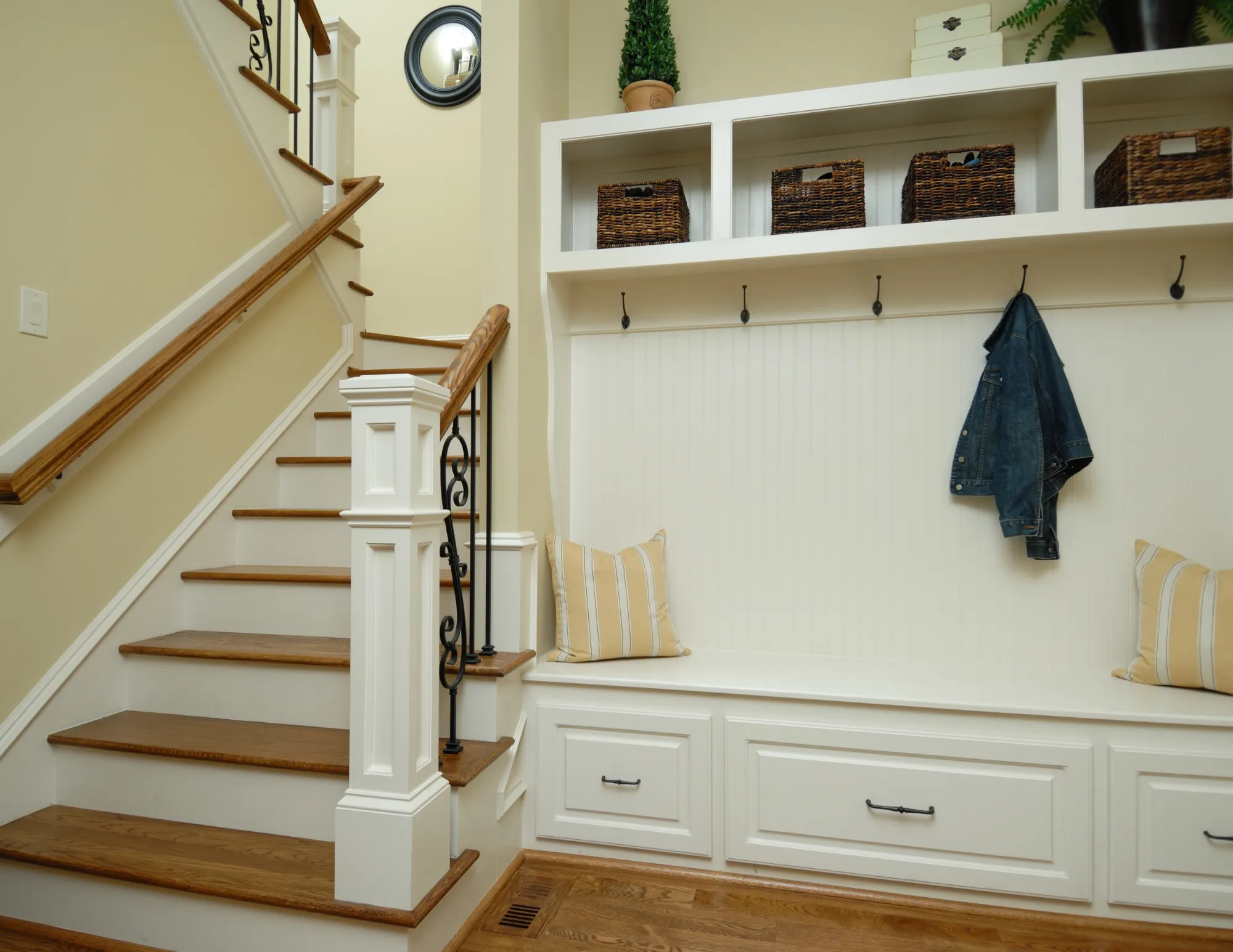 Instead of a generic coat rack, consider wall-mounted cubbies or recessed shelving right into the entryway or hallway. With hooks, drawers, and even phone-charging shelves — it’s part mudroom, part mission control. And it looks great.