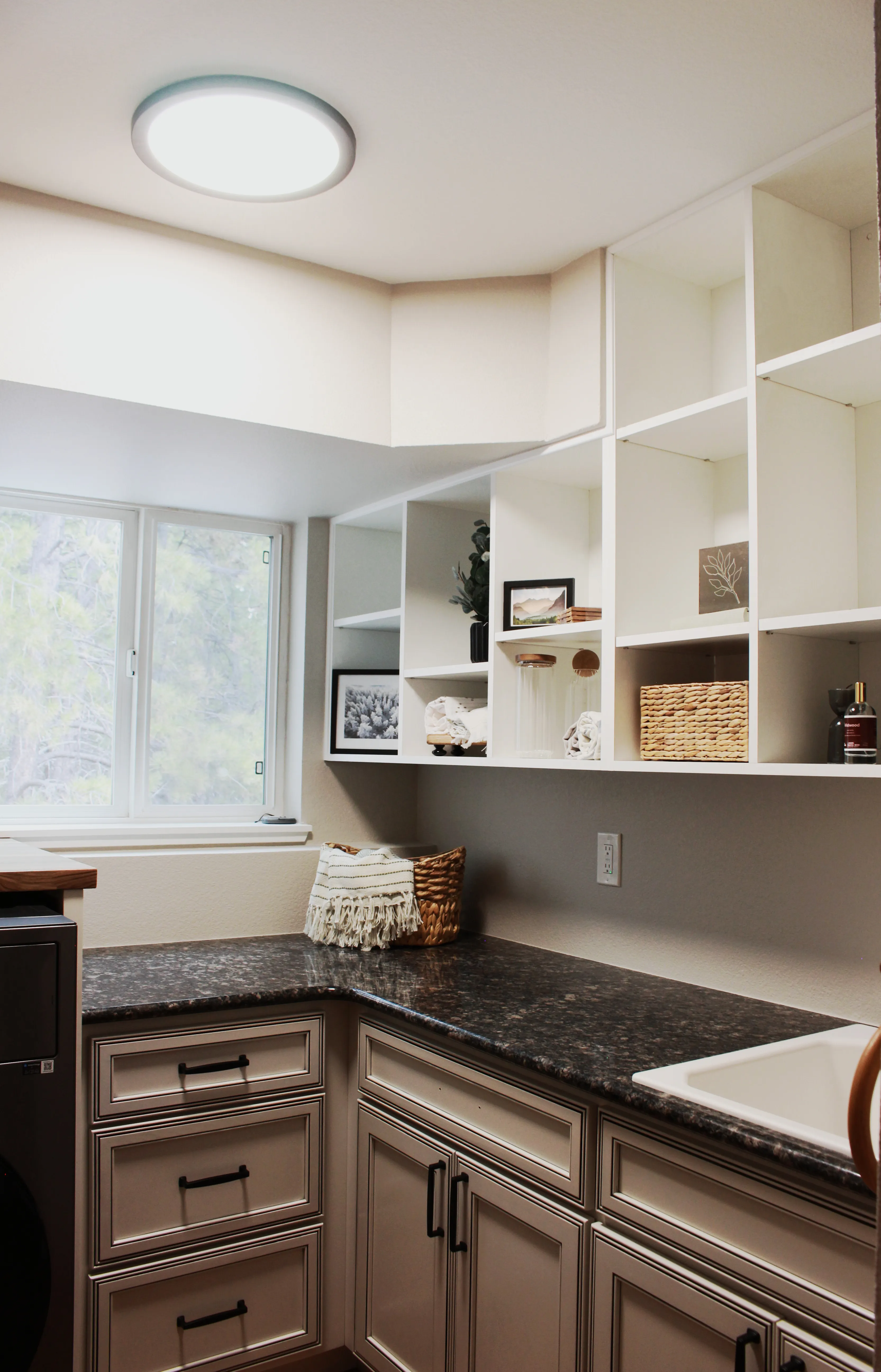 Laundry rooms are often the most chaotic little rooms in the house — half utility space, half catch-all zone. We’ve built upper cabinets, pull-out hampers, and floating shelves that turn chaos into calm.