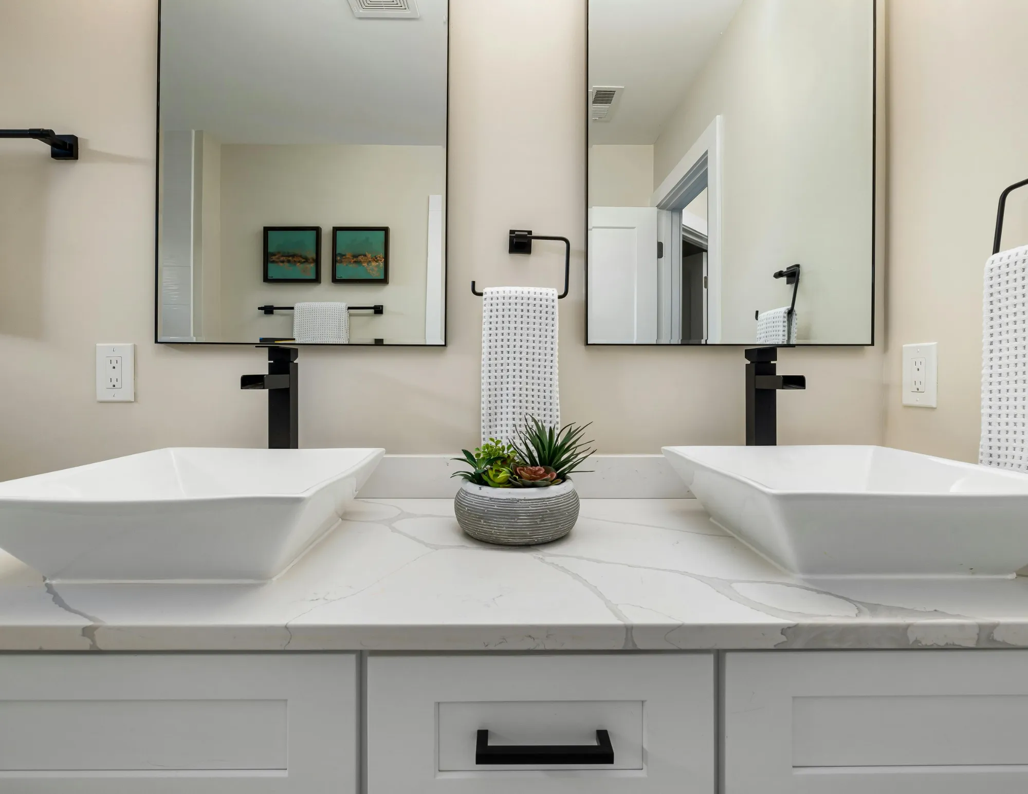 Vessel sinks sit above the countertop, creating a unique, sculptural focal point. They’re often found in designer bathrooms because they can instantly make a space feel high-end.
