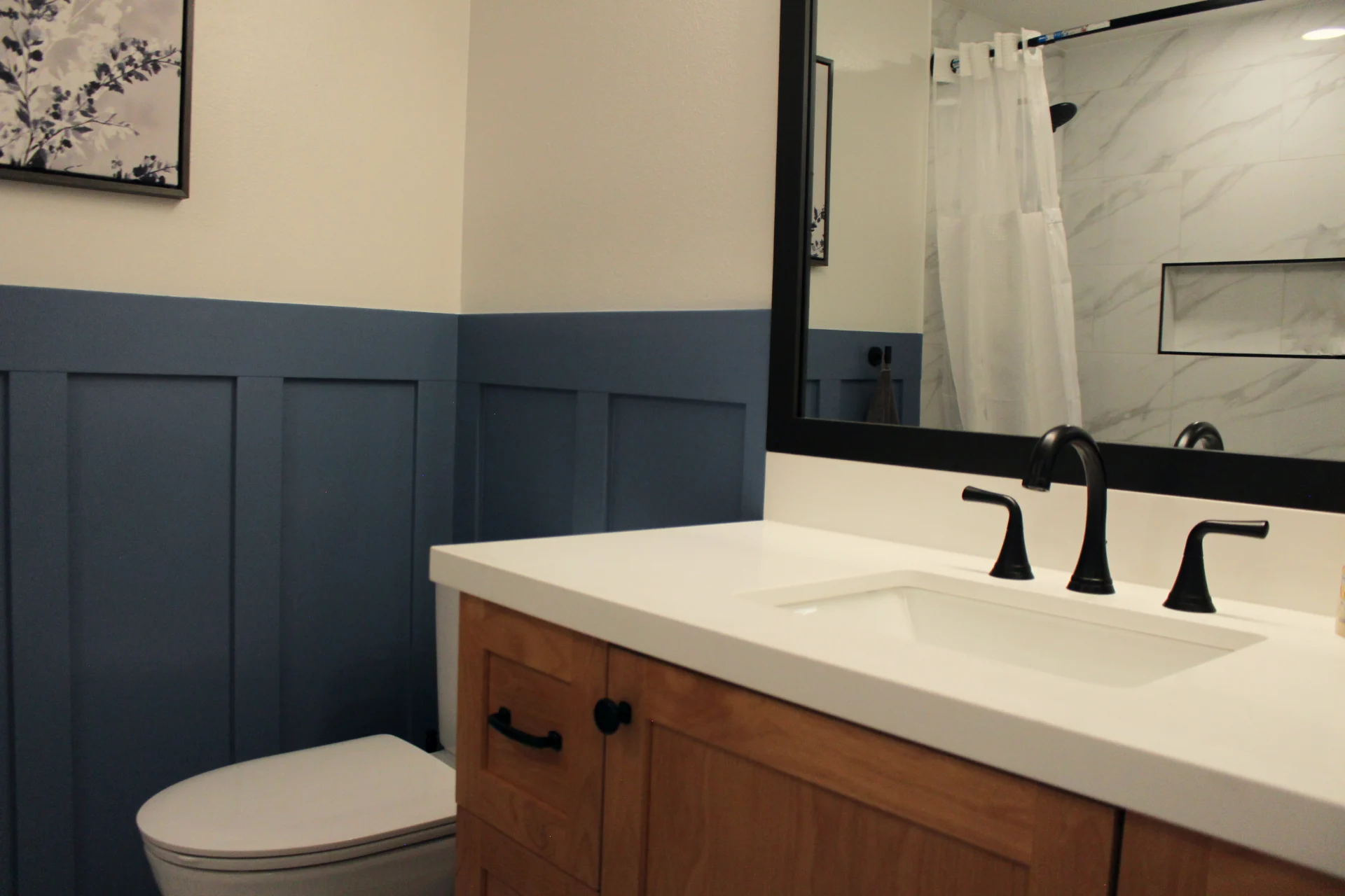 John’s bathroom remodel is all about balance—pairing bold contrasts with warm, welcoming finishes. The black and white shower sets a crisp, timeless tone, while the blue wainscoting adds depth and character. A custom natural wood vanity anchors the space, softening the bold palette with warmth and texture. The result is a bathroom that feels both modern and inviting.