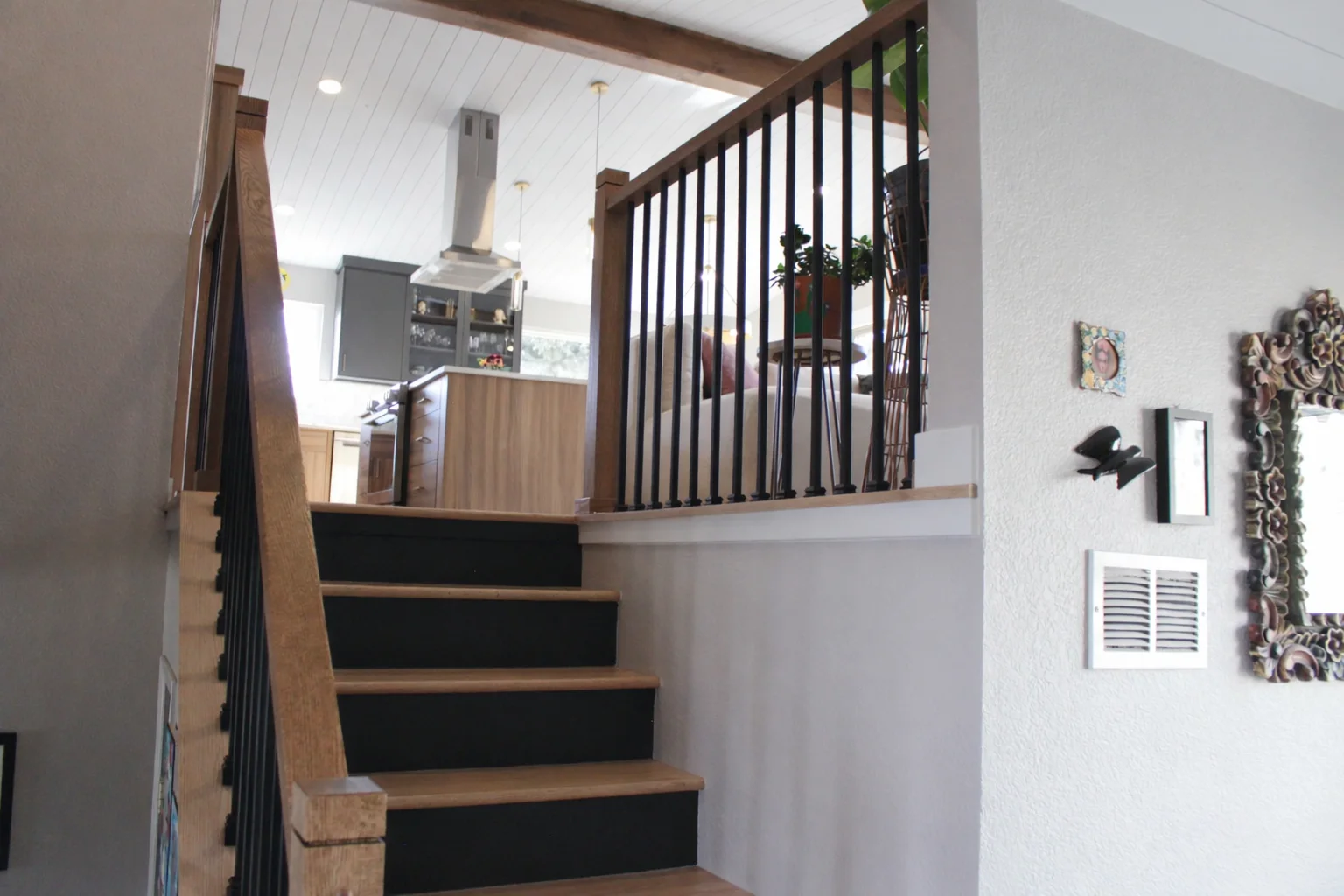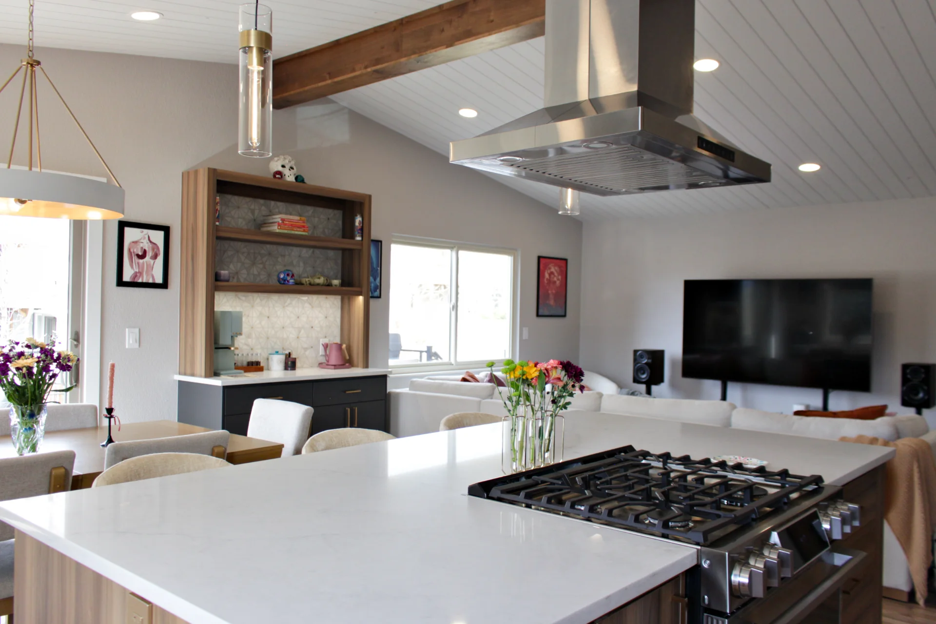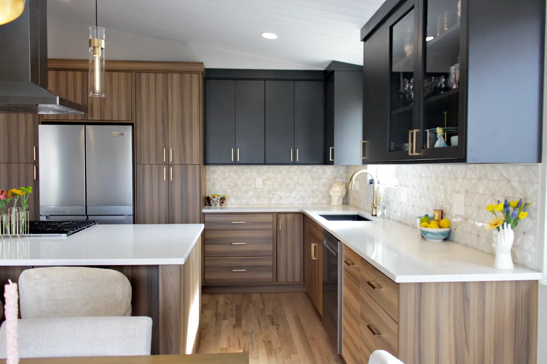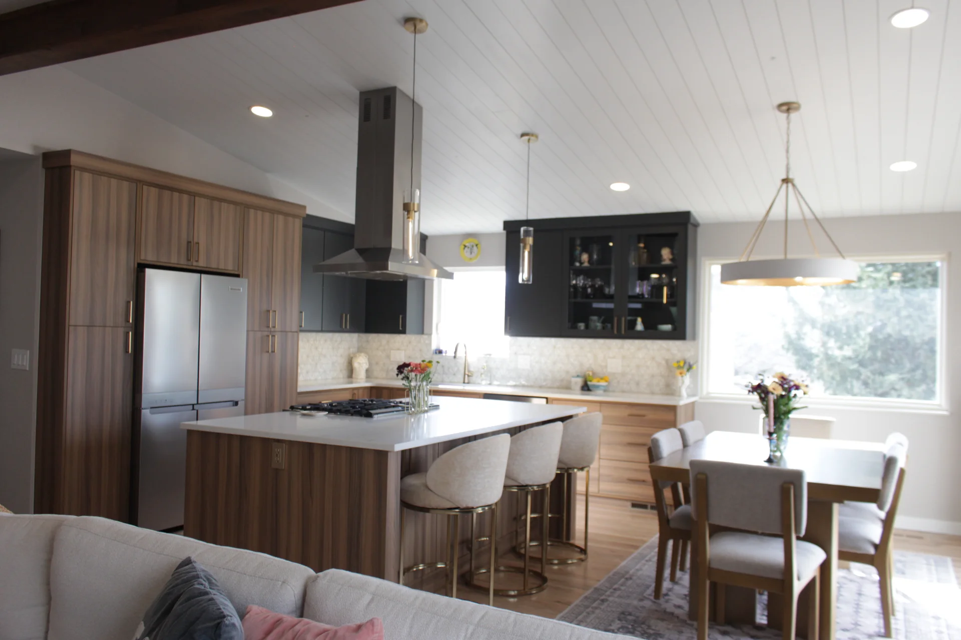 Leah & Michael’s remodel centers on a cohesive, elevated kitchen with custom craftsmanship throughout. Fully custom TFL inset cabinetry features black uppers for depth and contrast. Quartz countertops and a spacious island provide durability and function. Beyond the kitchen, refinished wood floors, new tongue-and-groove ceilings, and a custom wood slat accent wall elevate the home. Updated stairs and railings complete a refined, welcoming space.