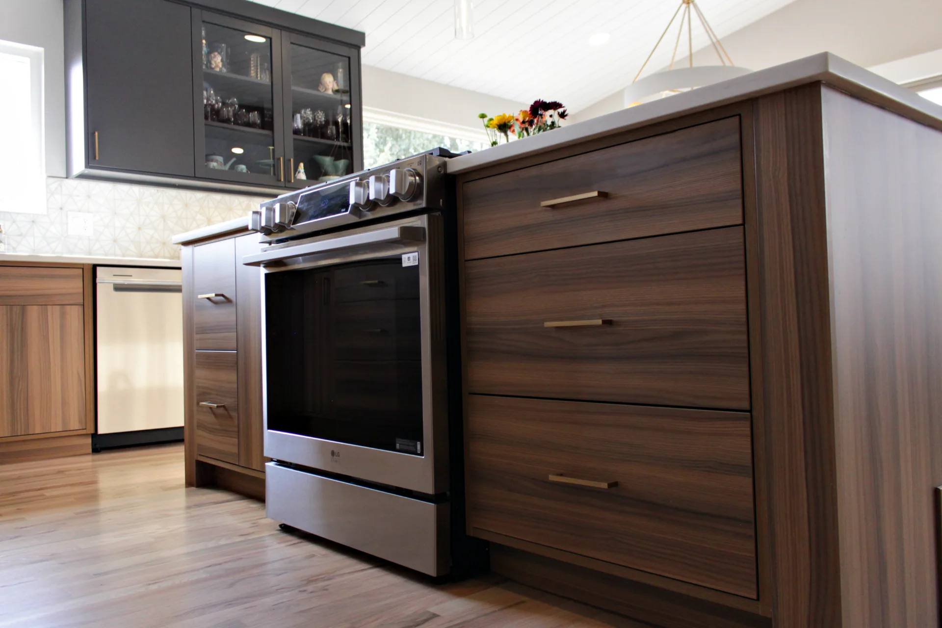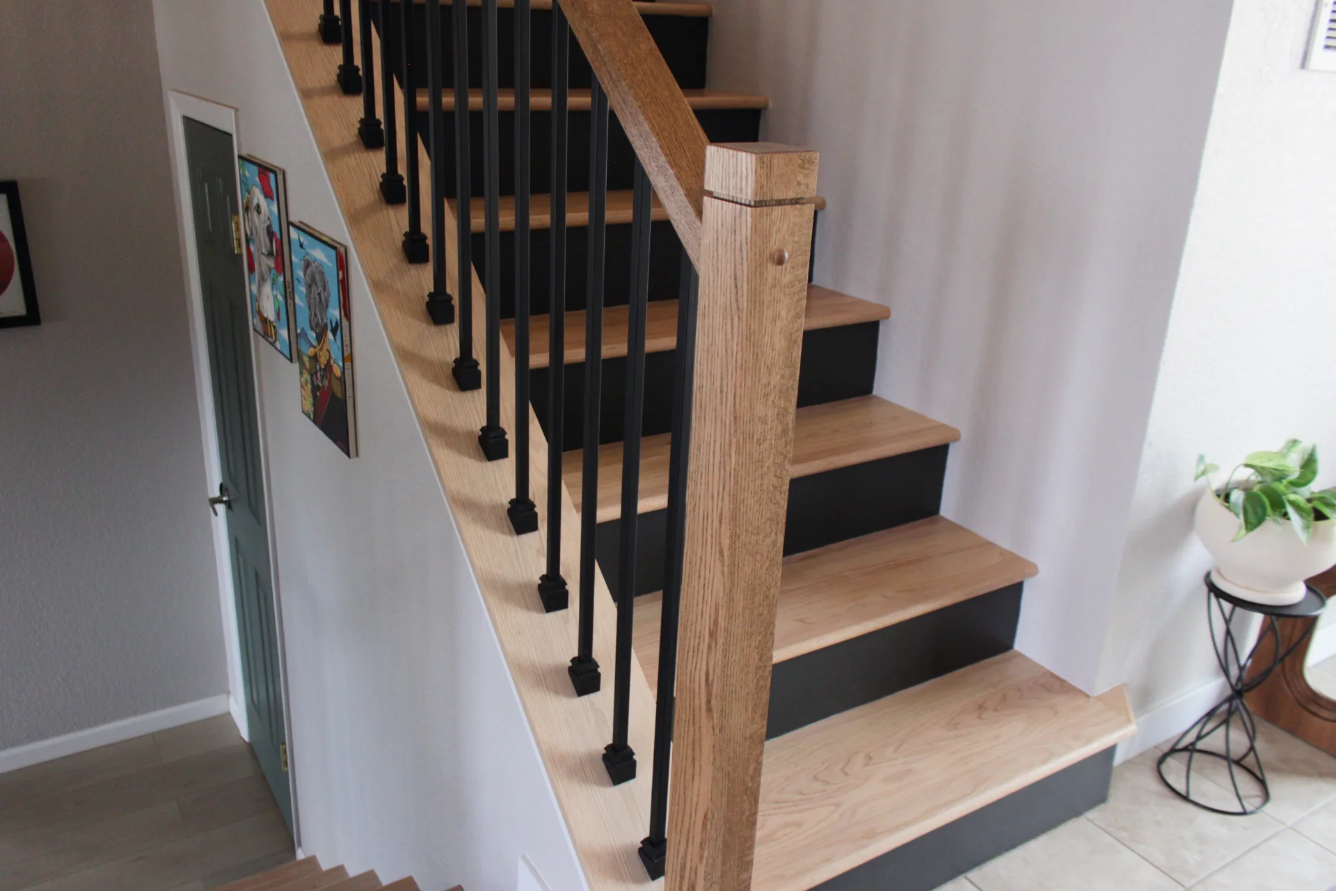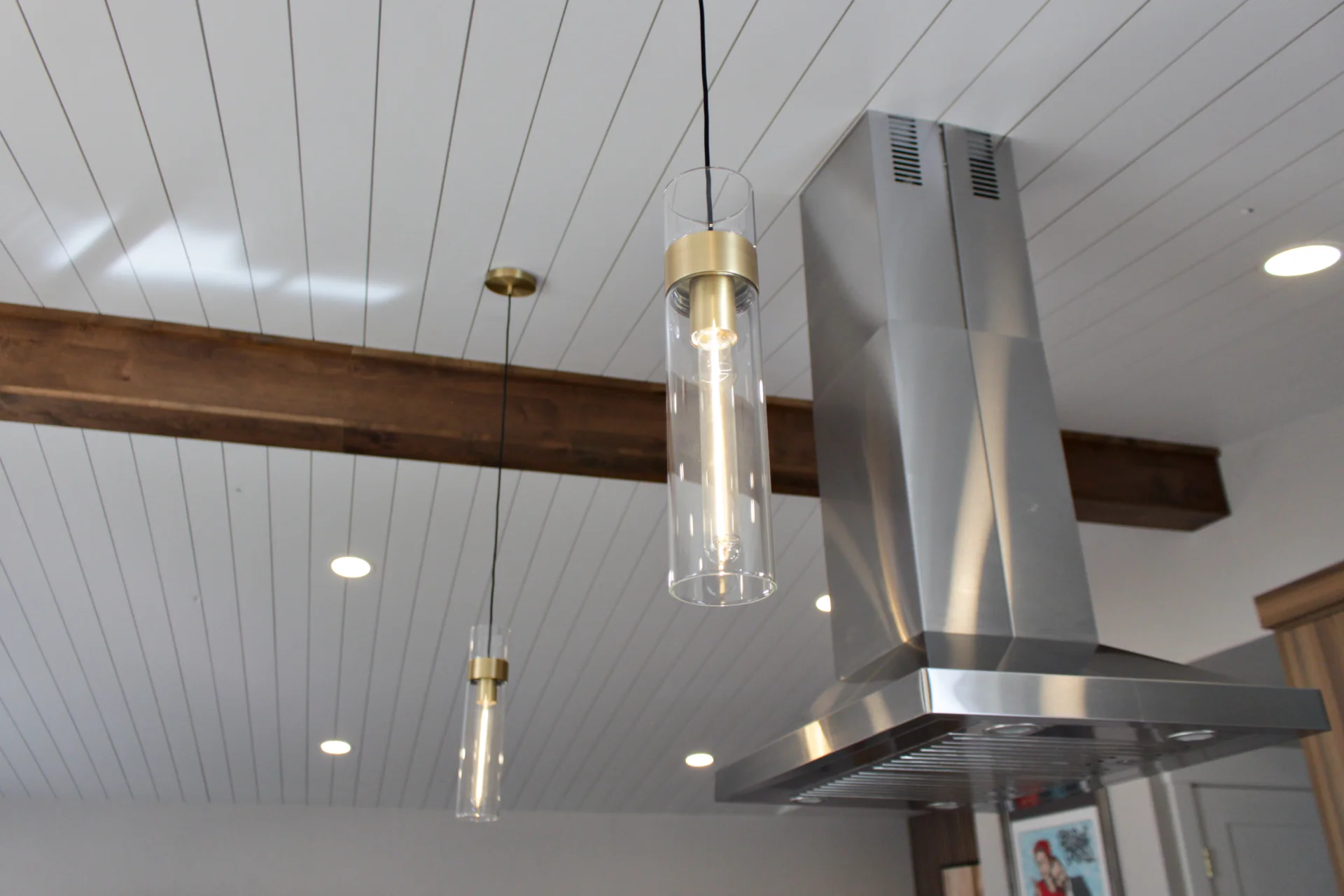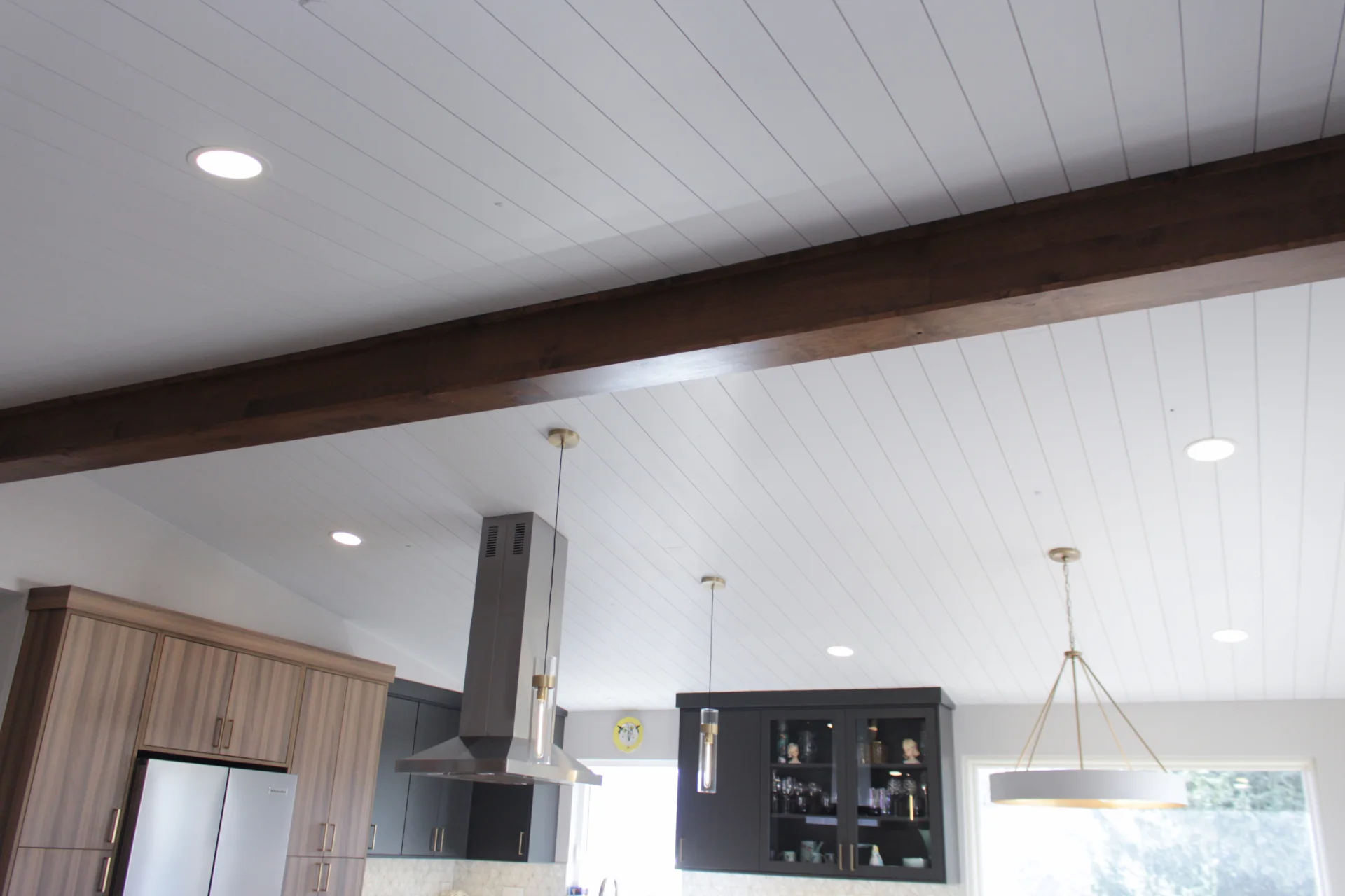 Leah & Michael’s remodel centers on a cohesive, elevated kitchen with custom craftsmanship throughout. Fully custom TFL inset cabinetry features black uppers for depth and contrast. Quartz countertops and a spacious island provide durability and function. Beyond the kitchen, refinished wood floors, new tongue-and-groove ceilings, and a custom wood slat accent wall elevate the home. Updated stairs and railings complete a refined, welcoming space.
