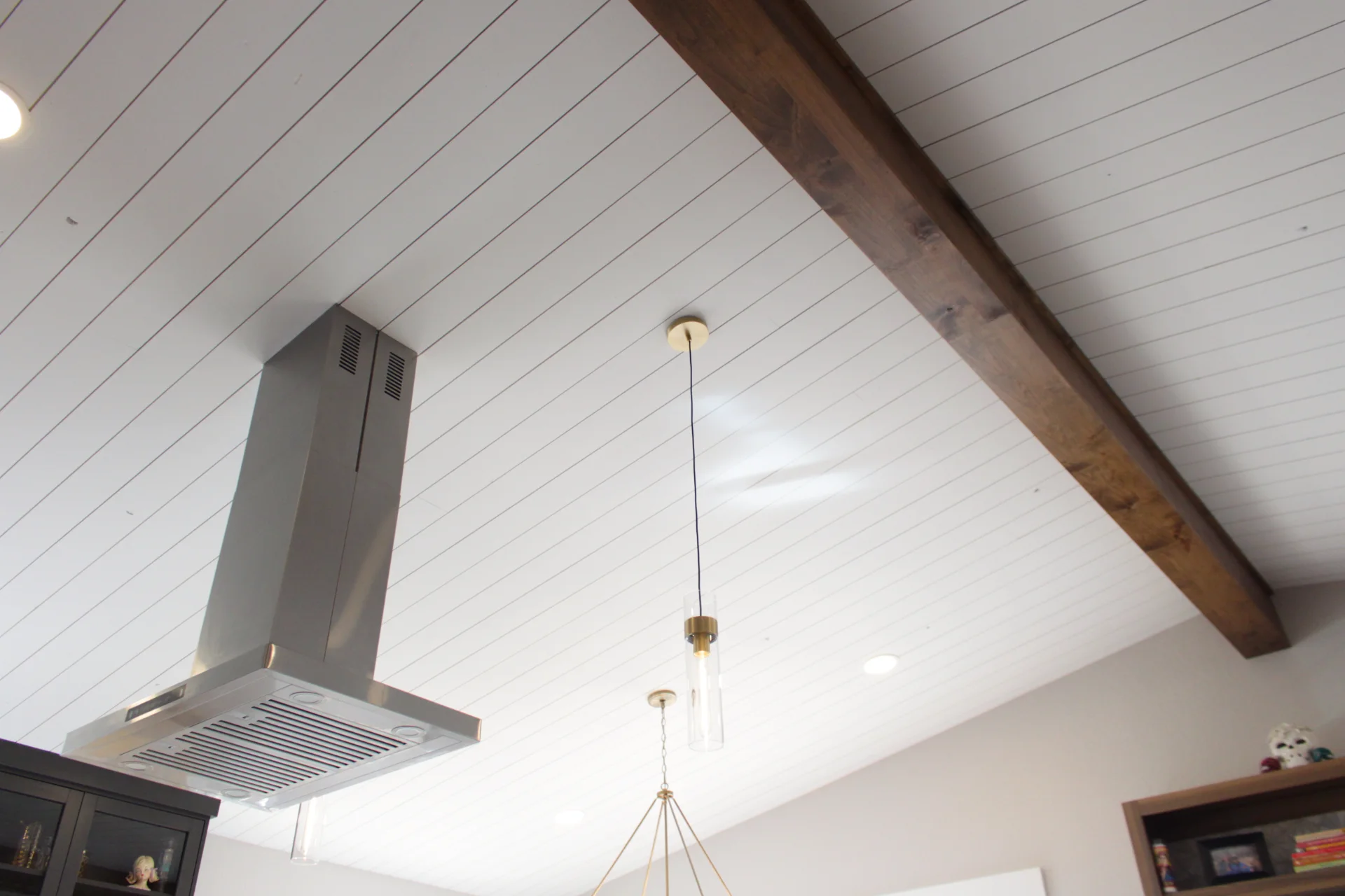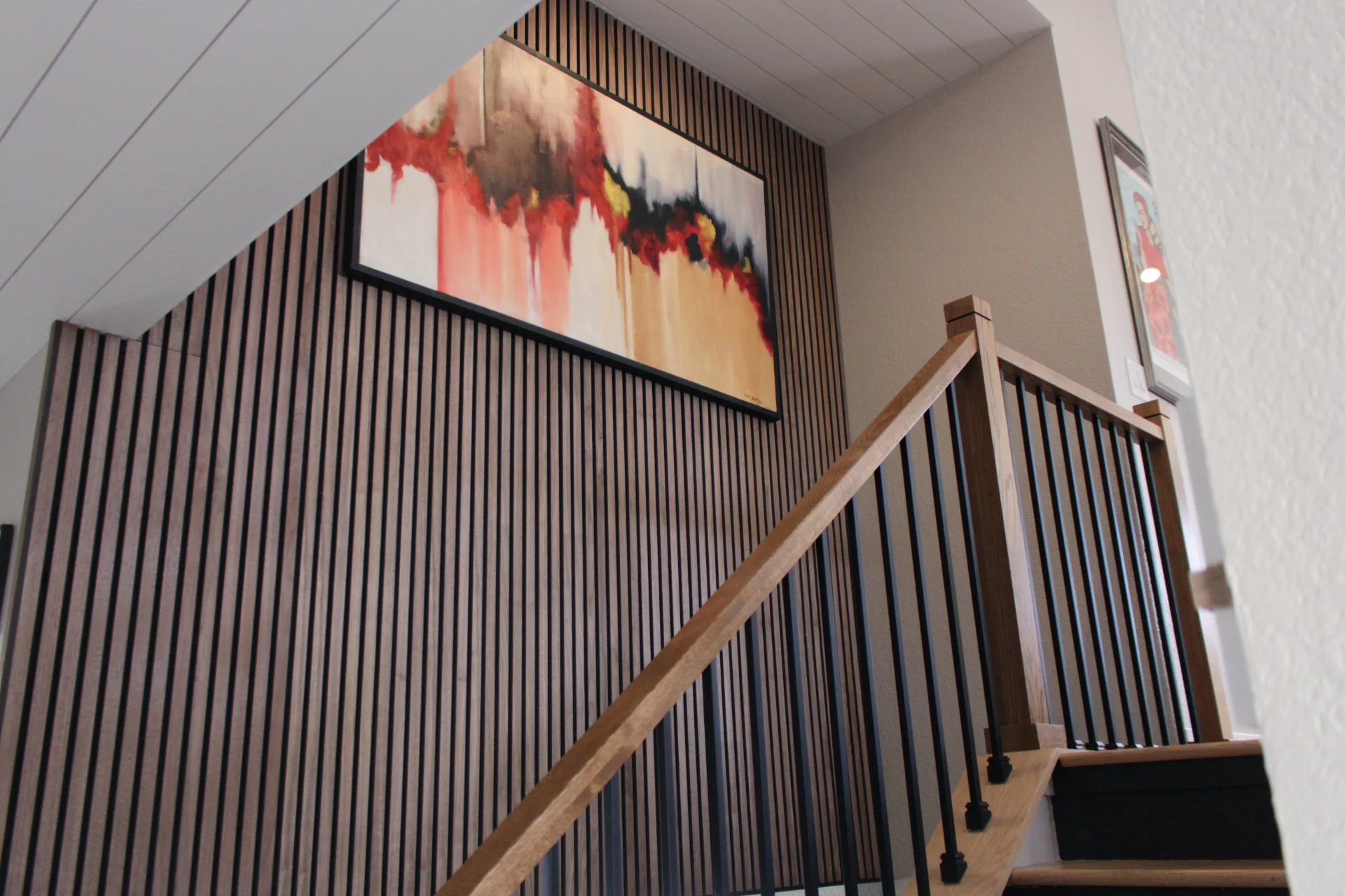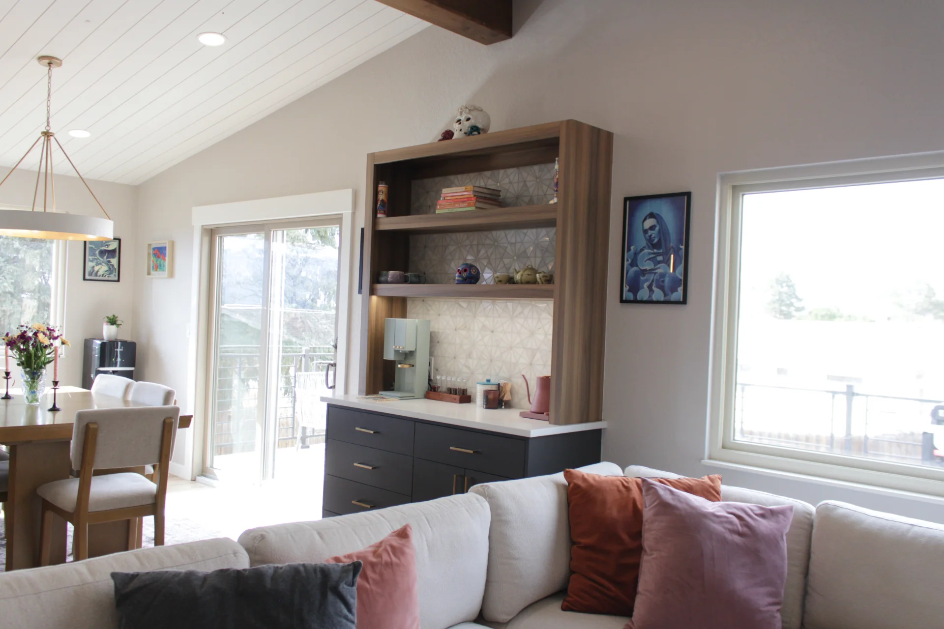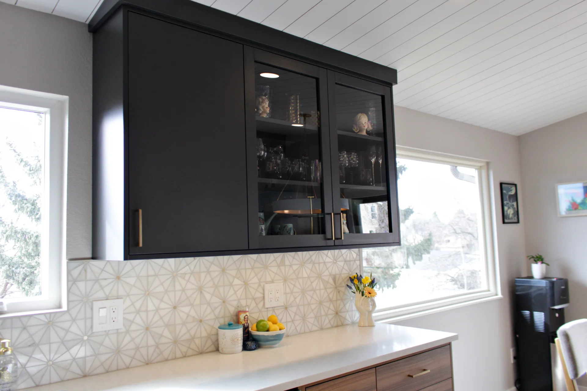 Leah & Michael’s remodel centers on a cohesive, elevated kitchen with custom craftsmanship throughout. Fully custom TFL inset cabinetry features black uppers for depth and contrast. Quartz countertops and a spacious island provide durability and function. Beyond the kitchen, refinished wood floors, new tongue-and-groove ceilings, and a custom wood slat accent wall elevate the home. Updated stairs and railings complete a refined, welcoming space.