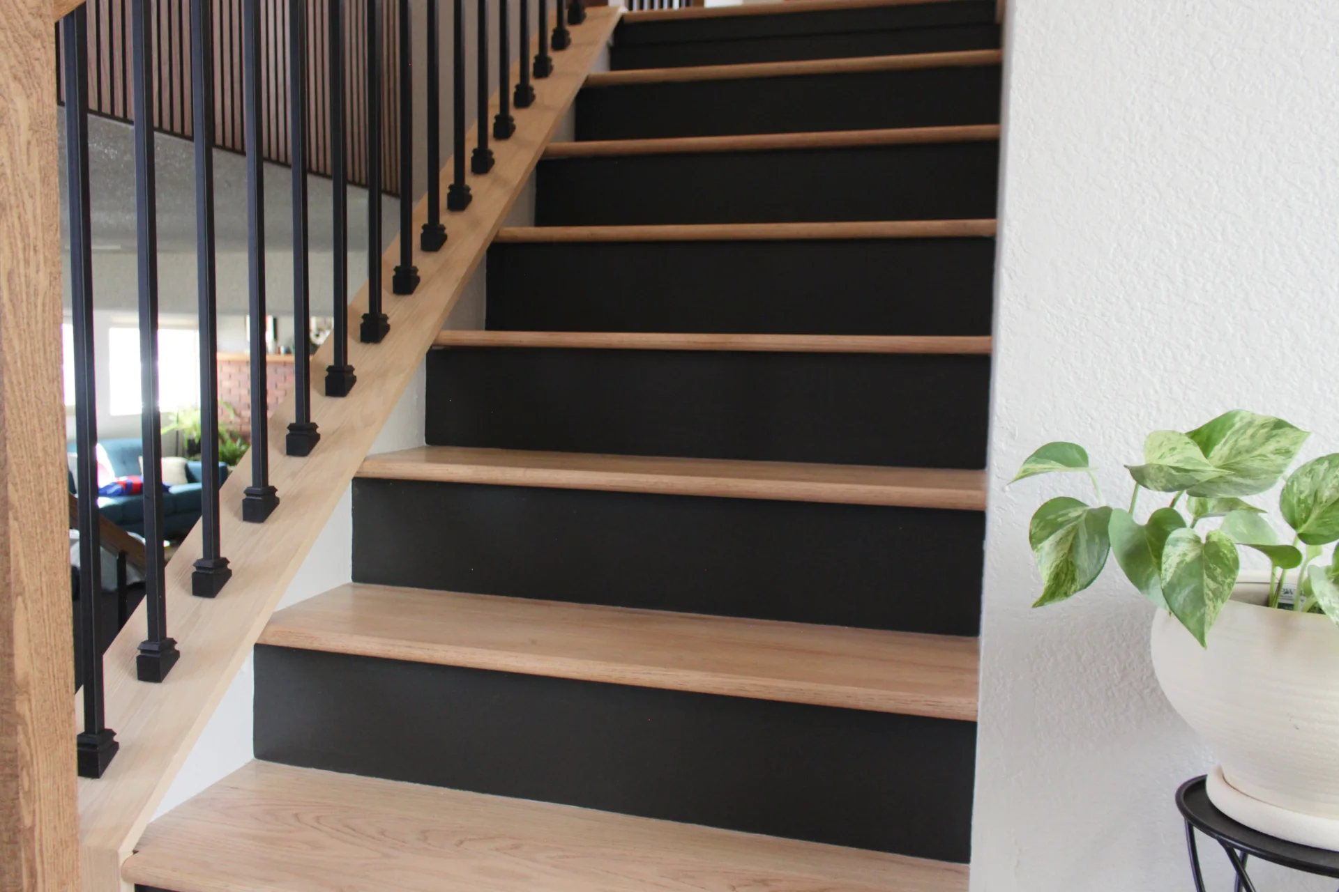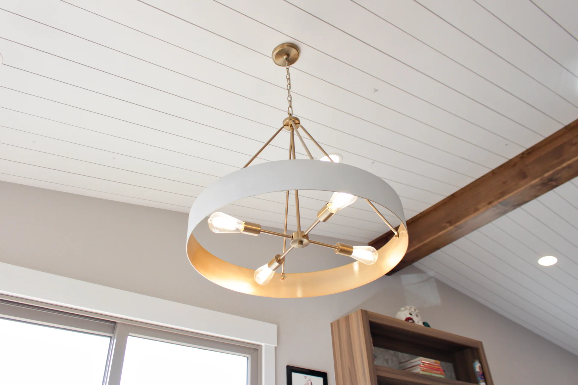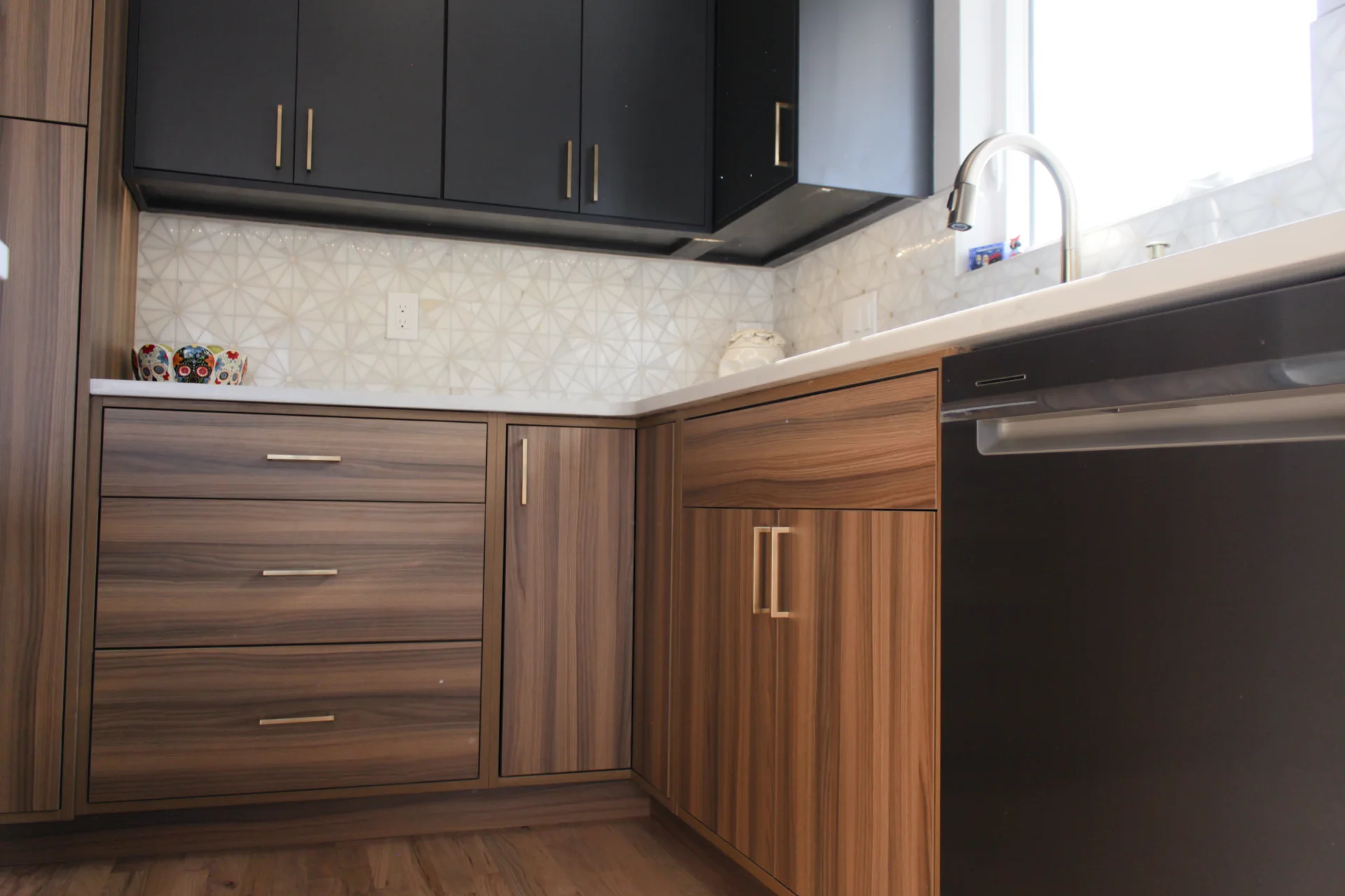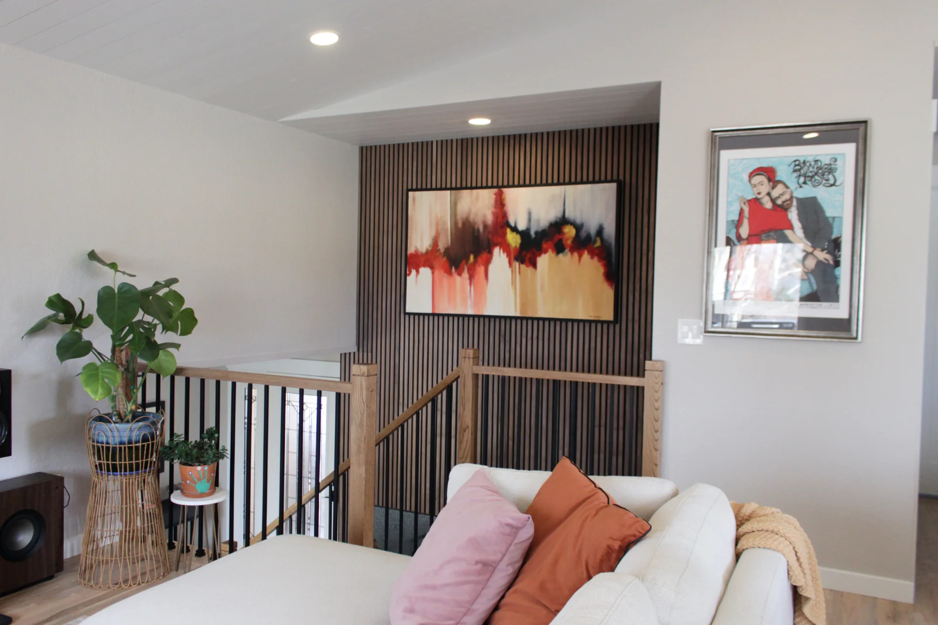 Leah & Michael’s remodel centers on a cohesive, elevated kitchen with custom craftsmanship throughout. Fully custom TFL inset cabinetry features black uppers for depth and contrast. Quartz countertops and a spacious island provide durability and function. Beyond the kitchen, refinished wood floors, new tongue-and-groove ceilings, and a custom wood slat accent wall elevate the home. Updated stairs and railings complete a refined, welcoming space.